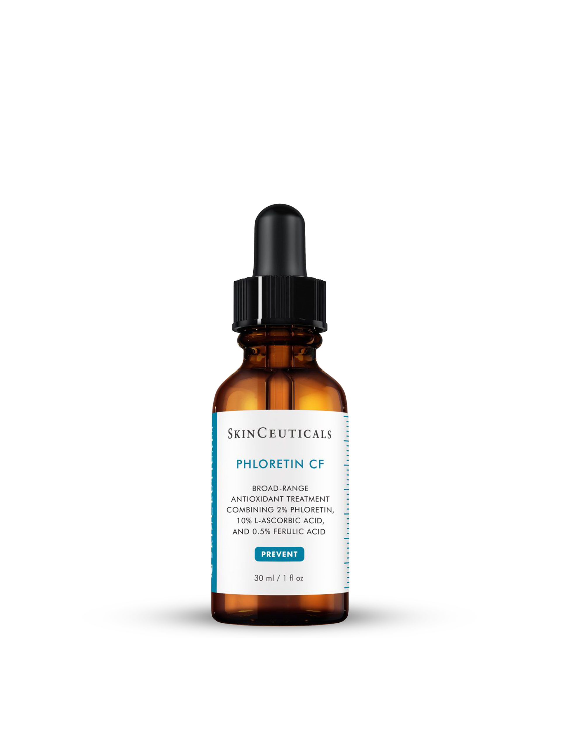 Phloretin CF features a patented synergistic combination of 2% phloretin, 10% pure vitamin C (l-ascorbic acid), and 0.5% ferulic acid for enhanced protection against atmospheric skin aging – environmental damage and premature signs of aging caused by free radicals from UVA/UVB, infrared radiation (IR-A), and ozone pollution (O3). In addition to antioxidant protective benefits, Phloretin CF improves the appearance of discoloration, fine lines, and uneven skin tone.